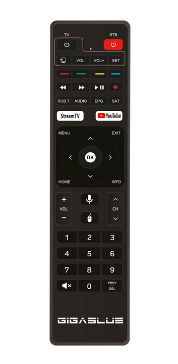 GigaBlue BT Fernbedienung unterstützt sowohl IR als auch Bluetooth-Funktion. Für die Bluetooth-Steuerung ist es nicht erforderlich, die Fernbedienung direkt auf den Fernseher zu richten. Die Fernbedienung unterstützt auch die Sprachsteuerung mit Google Assistant.