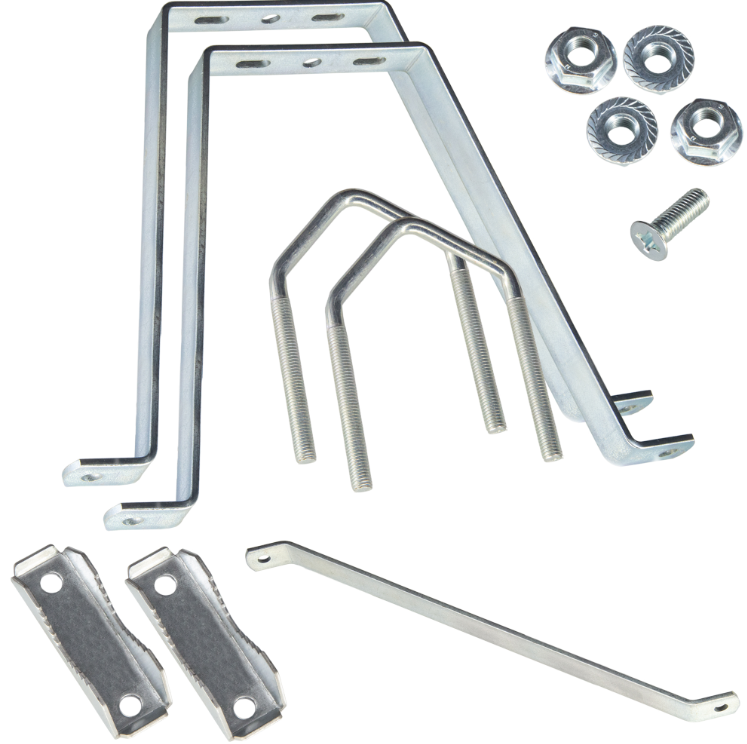 Das Set besteht aus 2 sehr robusten Traversen, zwei Zahnschellen, zwei U-Bügeln und einem dritten Arm zur zusätzlichen Stabilisierung für Mastrohre von 30-60 mm Durchmesser.