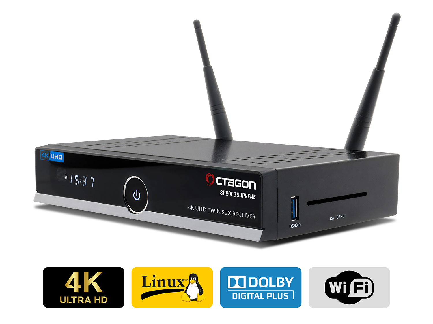 Der Octagon SF8008 V3 SUPREME 4K UHD-Receiver verfügt über zwei integrierte DVB-S2X Sat Tuner. Mit beeindruckender Leistung (15.000 DMIPS) und blitzschnellen Umschaltzeiten bietet er eine herausragende Benutzererfahrung.