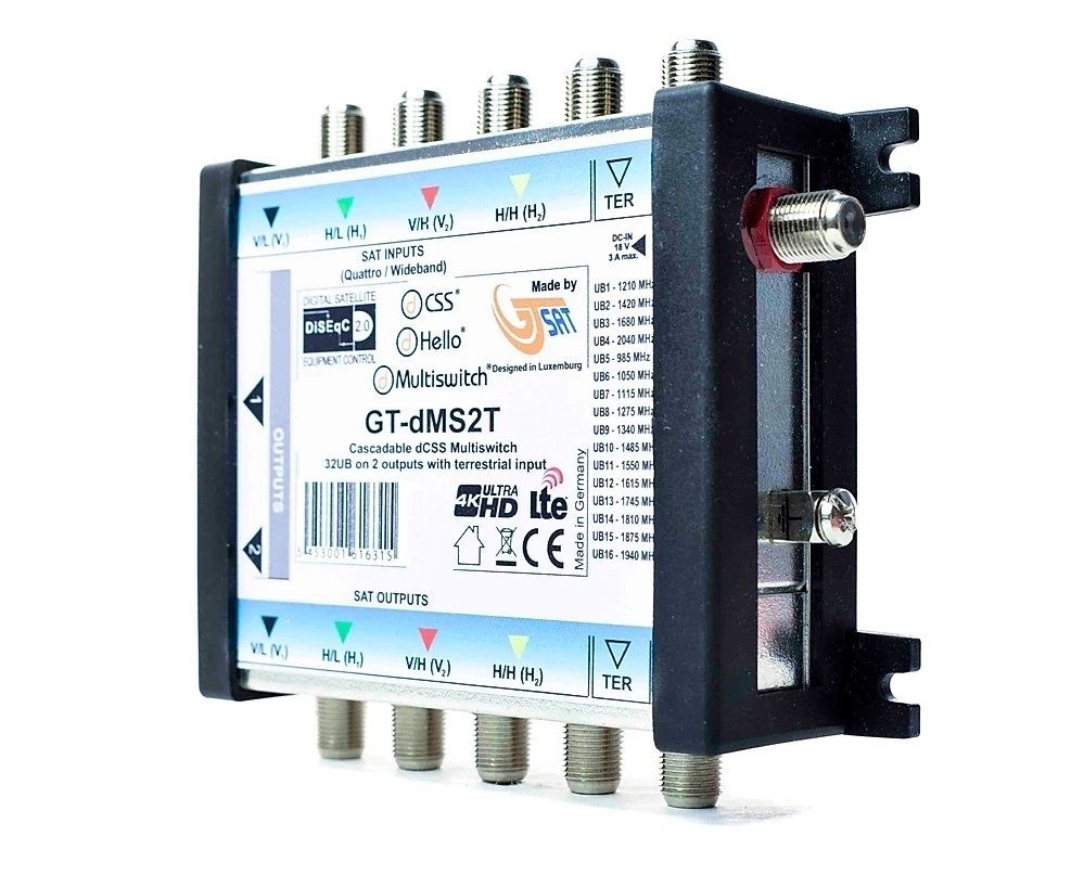 Der GT-dMS2T Multiswitch ermöglicht den Anschluss von bis zu 32 Teilnehmern mit zwei Koaxkabel. Die Receiver müssen entweder das Übertragungsprotokoll nach EN50607 oder das dHello Protokoll unterstützen.
