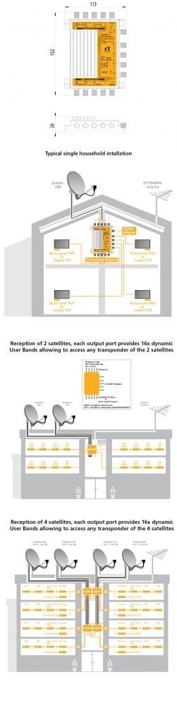 Der IDLU-UST110-CUO4O-32P ist ein kompakter, kaskadierbarer Unicable II Multischalter mit 4 Ausgängen, welche über eine automatische Signalerkennung verfügen und sowohl im Unicable II als auch im Legacy Modus betrieben werden können. Der Multischalter kann mit einem Quattro LNB (Auslieferungszustand) oder zwei Wideband LNBs für den Empfang von 2 Satelliten genutzt werden. Über den terrestrischen Eingang ist es möglich ein terrestrisches Antennensignal zum Empfang von UHF/VHF/DAB/Radio einzuspeisen. Das terrestrische Signal kann kann auf Wunsch (Ein/Aus Schalter) auch verstärkt über alle 4 Ausgänge ausgegeben werden. Bei Auslieferung arbeiten alle Ausgänge im Legacy Modus und können entweder durch 13/18V+0/22kHz oder über DiSEqC1.0/2.0 Befehle gesteuert werden. Der Ausgang schaltet in den Unicable Modus sobald er ein EN50494 oder EN50607 Signal empfängt und liefert dann 16 User Bands (die Frequenztabelle entnehmen sie bitte den Spezifikationen).