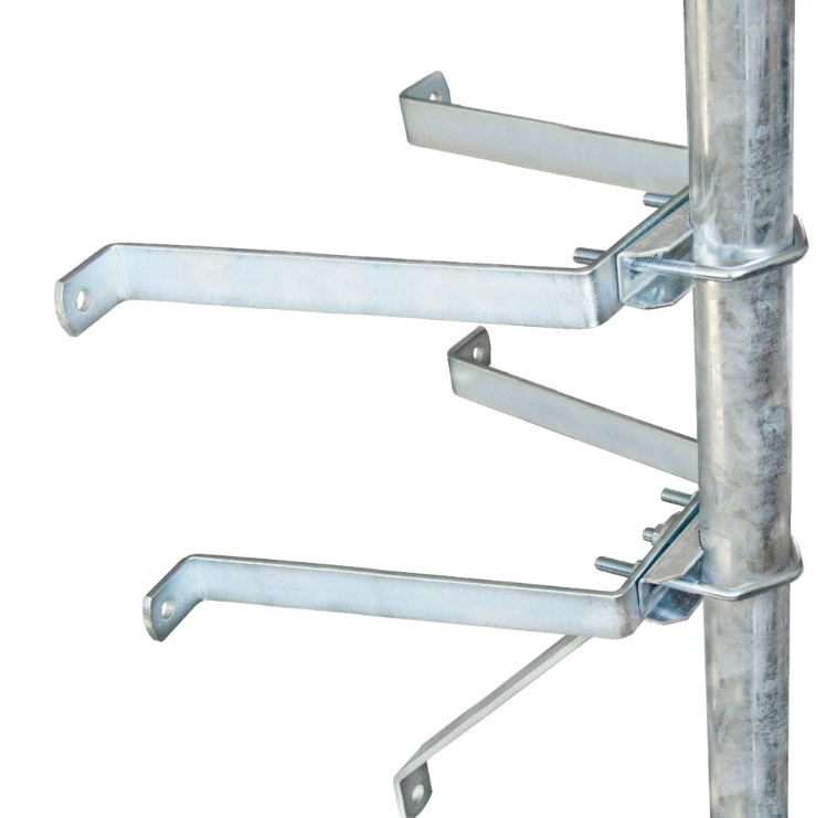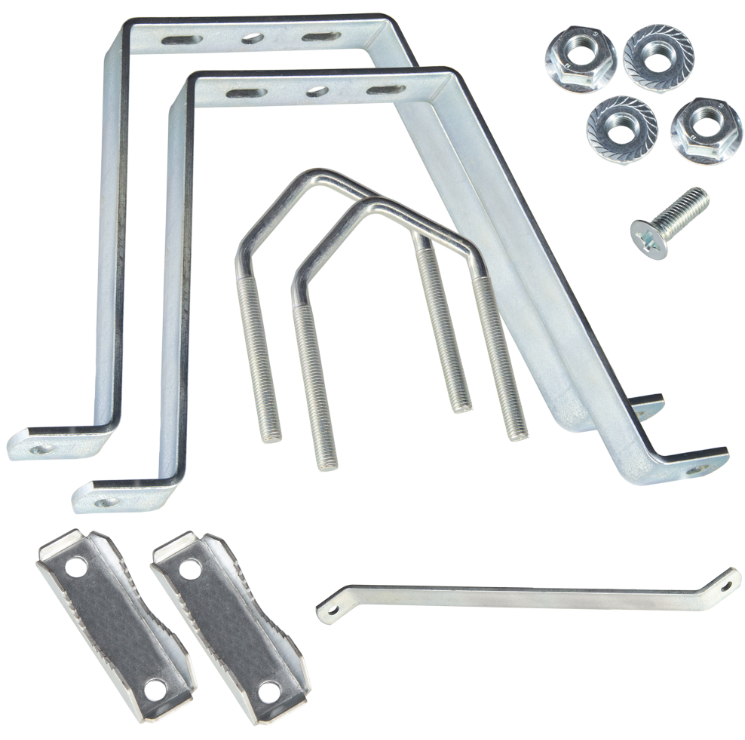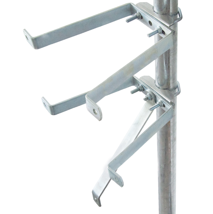 Das Set besteht aus 2 sehr robusten Traversen, zwei Zahnschellen, zwei U-Bügeln und einem dritten Arm zur zusätzlichen Stabilisierung für Mastrohre von 30-60 mm Durchmesser.
