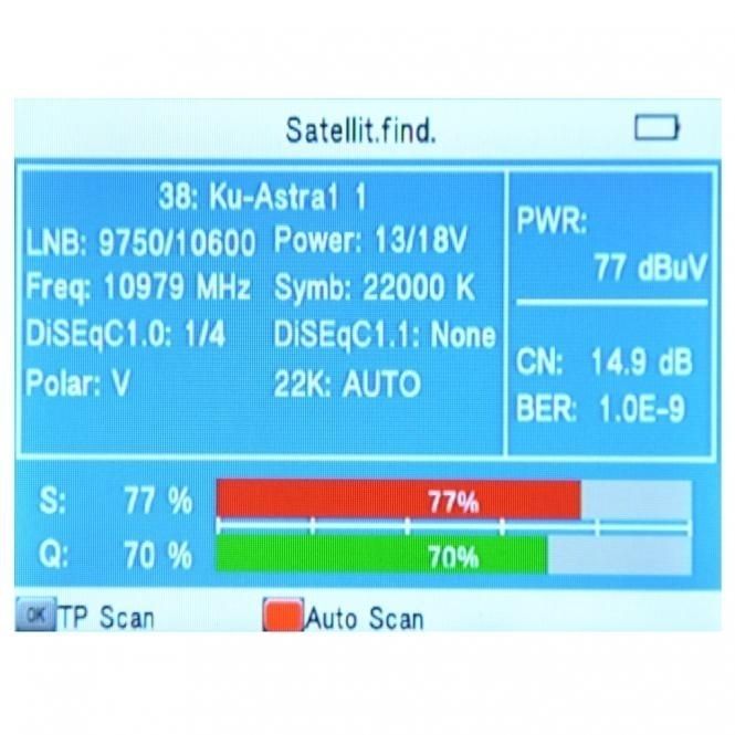 Als weitere Messwerte ermittelt es das Signal-/Rauschverhältnis (C/N) und die Bitfehlerrate (BER). Zusätzlich kann die Bildqualität über den hochauflösenden 8,9 cm TFT-LCD-Bildschirm überprüft werden.