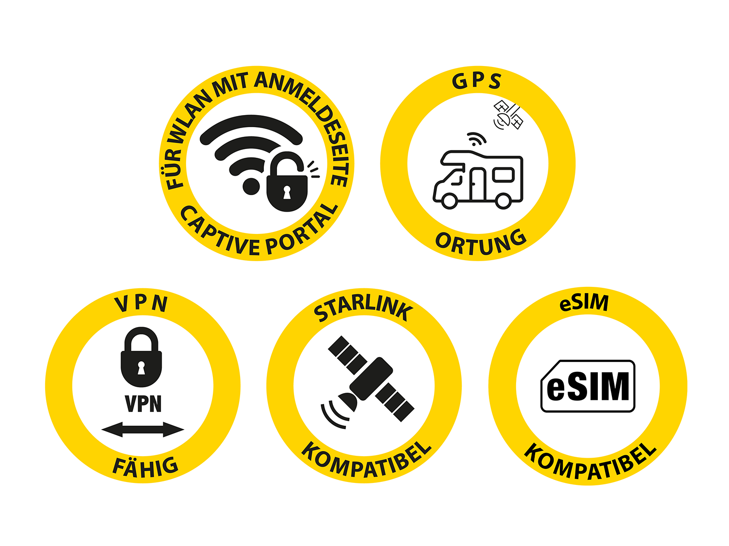 Im Wohnmobil oder Wohnwagen ist eine stabile Internetverbindung für Smartphone, Tablet, Laptop, Smart TV oder Spielekonsole oft eine Herausforderung. SELFSAT bietet verschiedene Lösungen für WLAN-Versorgung unterwegs. Besonders komfortabel macht dieses Modell die Ausstattung mit einer eSIM, welche z. B. im Ausland, neben der Nutzung von physikalischen SIM-Karten, auch die Nutzung von bis zu 6 eSIM Profilen ermöglicht. Die SELFSAT Router können über das 12/24 Volt Bordnetz betrieben werden und empfangen WLAN oder Mobilfunknetz-Signale von außen, um sie im Fahrzeug als privates, geschütztes WLAN auszustrahlen. Eine Außenantenne sorgt für guten Empfang und die Überbrückung der Abschirmung der Außenhülle des Fahrzeugs. Die Montage ist einfach und die Antenne ist staub- und wasserdicht. Die Verbindung mit dem Router erfolgt über QR-Codes oder WLAN-Namen und Passwort. Die Bedienung ist benutzerfreundlich, erfolgt über den Internet Browser und erfordert somit keine separate App. Der Router unterstützt die Anmeldung an Campingplatz-WLANs mit Anmeldeseite (Captive Portal), die GPS-Ortung des Wohnmobils, die Installation von VPNs zum Streamen im Ausland und ist Starlink kompatibel. Die Dachantenne hat einen DAB+ Anschluss mit FAKRA G (männlich) zum Anschluss eines Fahrzeugradios.