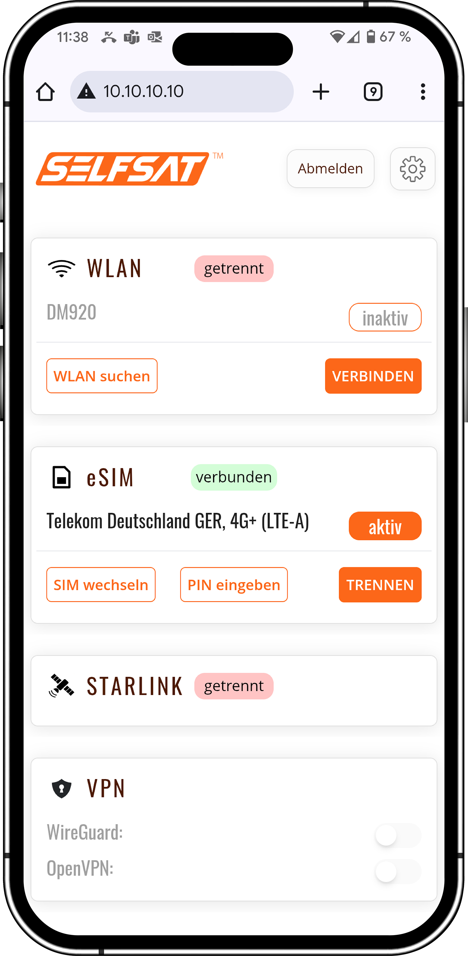 Im Wohnmobil oder Wohnwagen ist eine stabile Internetverbindung für Smartphone, Tablet, Laptop, Smart TV oder Spielekonsole oft eine Herausforderung. SELFSAT bietet verschiedene Lösungen für WLAN-Versorgung unterwegs. Besonders komfortabel macht dieses Modell die Ausstattung mit einer eSIM, welche z. B. im Ausland, neben der Nutzung von physikalischen SIM-Karten, auch die Nutzung von bis zu 6 eSIM Profilen ermöglicht. Die SELFSAT Router können über das 12/24 Volt Bordnetz betrieben werden und empfangen WLAN oder Mobilfunknetz-Signale von außen, um sie im Fahrzeug als privates, geschütztes WLAN auszustrahlen. Eine Außenantenne sorgt für guten Empfang und die Überbrückung der Abschirmung der Außenhülle des Fahrzeugs. Die Montage ist einfach und die Antenne ist staub- und wasserdicht. Die Verbindung mit dem Router erfolgt über QR-Codes oder WLAN-Namen und Passwort. Die Bedienung ist benutzerfreundlich, erfolgt über den Internet Browser und erfordert somit keine separate App. Der Router unterstützt die Anmeldung an Campingplatz-WLANs mit Anmeldeseite (Captive Portal), die GPS-Ortung des Wohnmobils, die Installation von VPNs zum Streamen im Ausland und ist Starlink kompatibel. Die Dachantenne hat einen DAB+ Anschluss mit FAKRA G (männlich) zum Anschluss eines Fahrzeugradios.