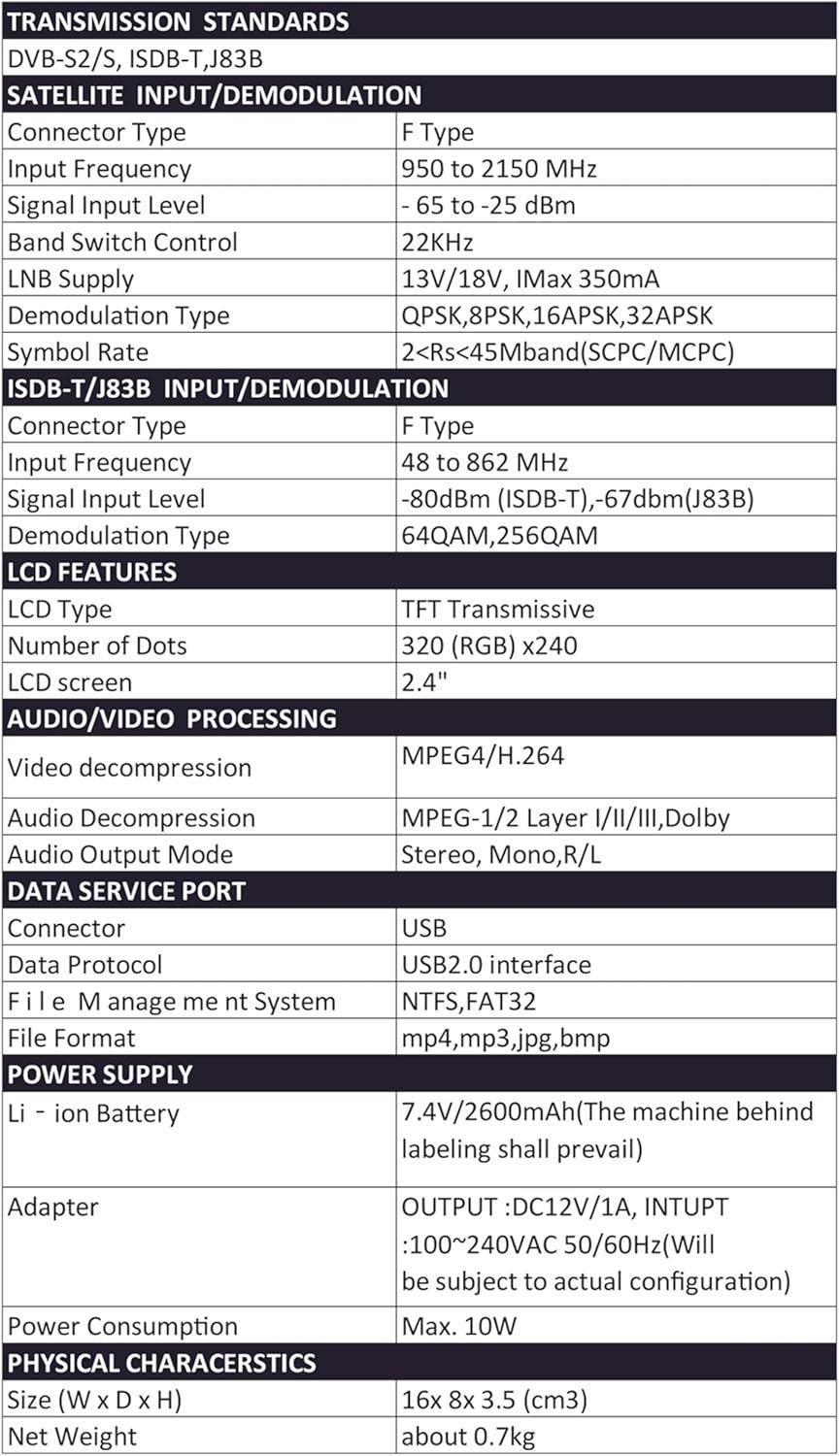 - Einsatzmöglichkeiten:Das Gerät eignet sich sowohl bei der Installation einer Satellitenantenne zum schnellen Auffinden eines gewünschten DVB-S2/S, IDVB-T oder DVB-C Signals,