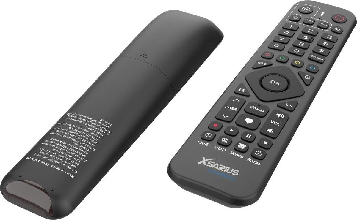 Die Xsarius IR-L1 Advanced Remote Control enthält eine Vielzahl von Tasten, die speziell für die optimale Bedienung der Xsarius-Geräte konzipiert sind. Schaltflächen wie „Gruppe“, „Seite“, „Vod“, „Live“, „Serie“, „Radio“, „Favoriten“, „EPG“ und „TV-Steuerung“ bieten schnellen Zugriff auf die wichtigsten Funktionen und ermöglichen Ihnen um schnell und einfach zwischen verschiedenen Inhalten zu wechseln.