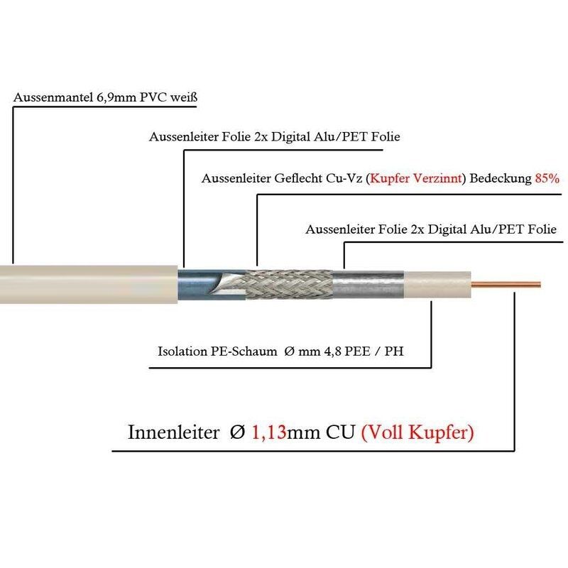 Premium Class A++ Koaxialkabel Eca, 3-fach geschirmt 100 m Einwegspule - 6,9 mm - PVC weiß - Schirmungsmaß typ. 130 dB - Klasse A++ - Metermarkierung - Aufbau: 1,13 Cu/4,8 Al/CuSn/Al, Folie verklebt;